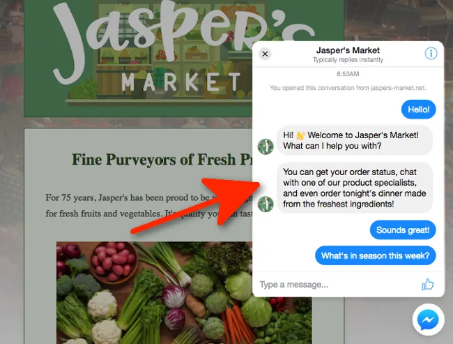 In order to show the customer chat plugin on any of your websites, you need to follow a few simple steps. Once you have done them, the Facebook chatbot will appear on the website - just like you see in the picture here - and visitors will be immediately able to use it to chat with you and your chatbots.